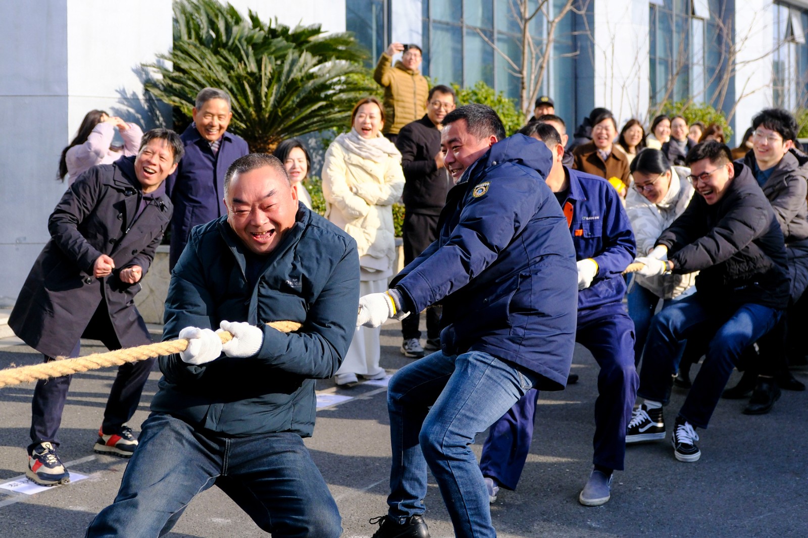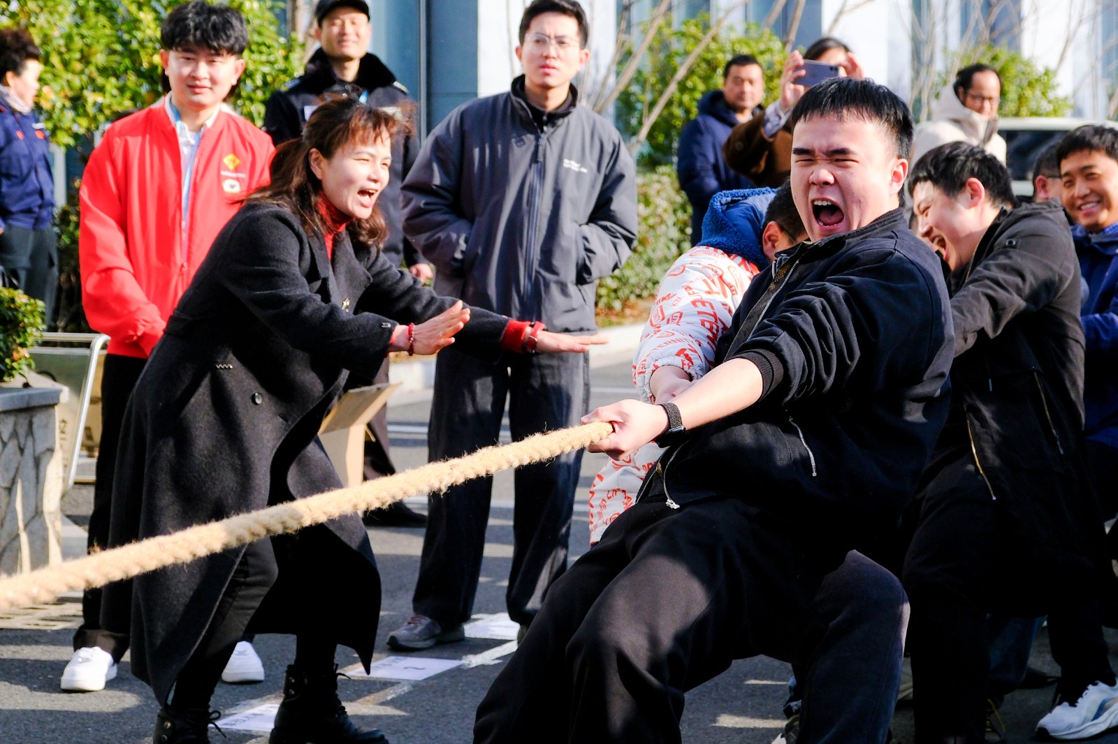 隨著裁判員的一聲清脆哨響,兩大園區的拔河比賽正式打響。參賽隊員們起繩、拉緊、挺身、開拔,瞬間的爆發力沖向云霄,各個憋的面紅耳赤,使出了渾身力氣,大家一起“一二一二”的喊著口號,卯足勁往一處使,將力量擰成一股繩,團結一致、頑強拼搏。場邊啦啦隊們也不甘示弱,吶喊聲、助威聲一波一波沖擊著賽場,氣氛熱烈愉悅。